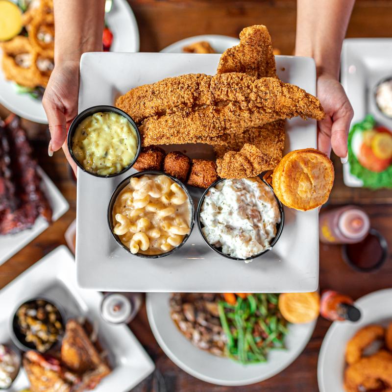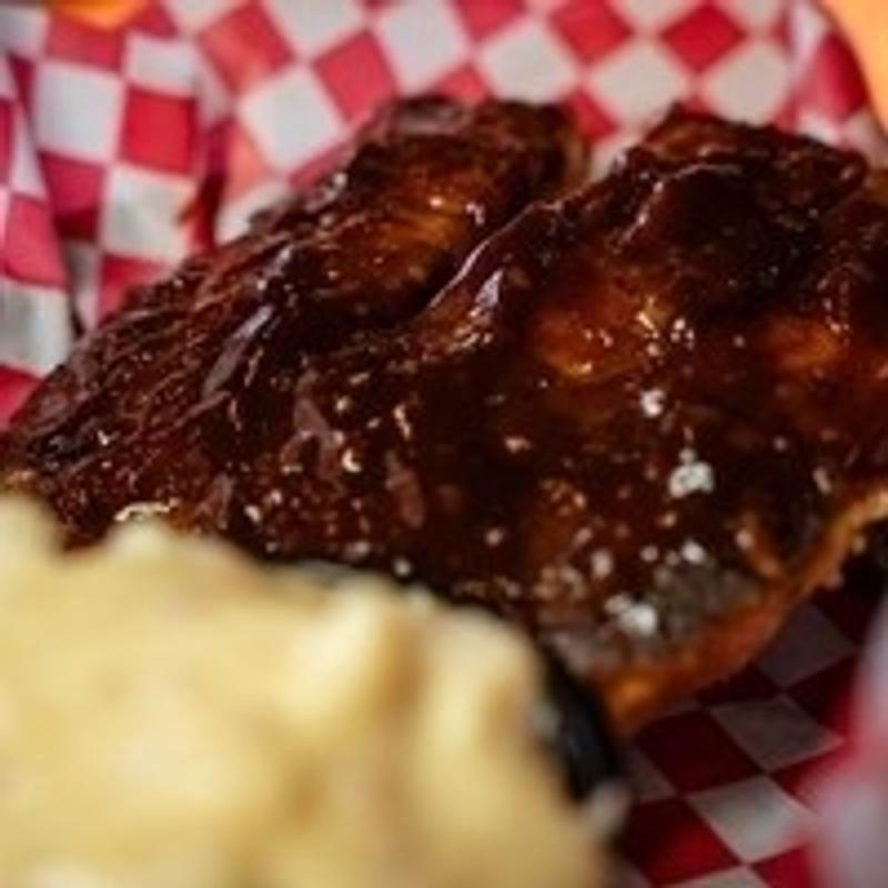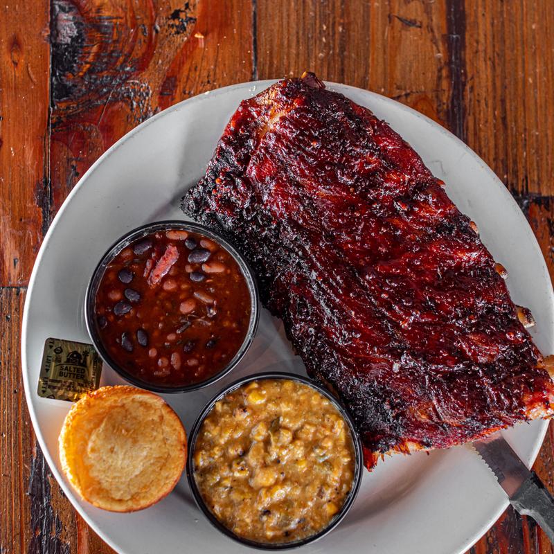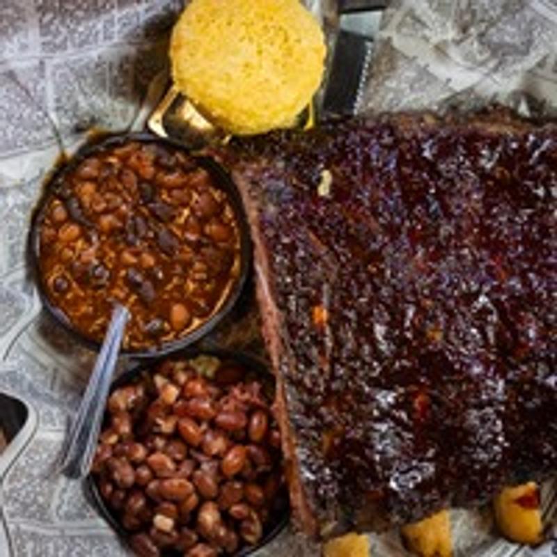 Half Rack of St. Louis Ribs • Half Chicken • Quarter Pound of Pulled Pork • Quarter Pound Beef Brisket • 4 small sides • 3- cornbread | Serves up to 2-4 people (depending on appetite). No Substitutions.