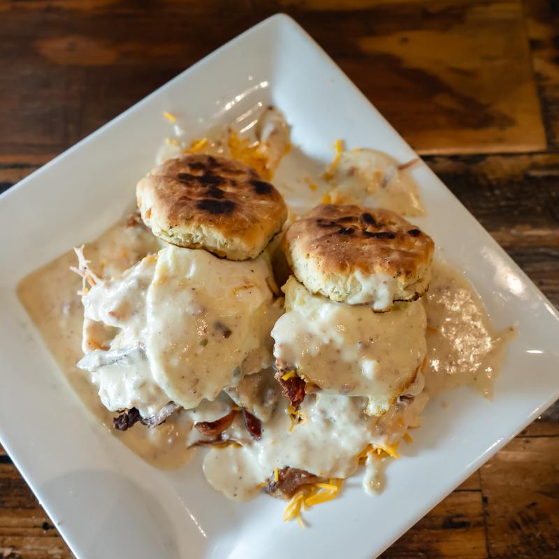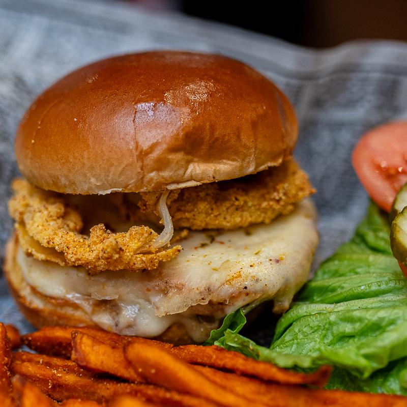 Grilled chicken breast gets rubbed & sauteed with our Cajun spices. Topped with melted Pepper Jack & fried onion straws. Served with lettuce, pickles, & tomato | Add Pulled Pork (+$2) or Beef Brisket (+$3)
