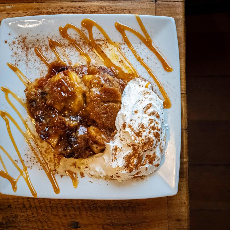 French bread, cream, bittersweet chocolate & pecans. Served with a whiskey cream sauce, chocolate sauce & whipped cream.