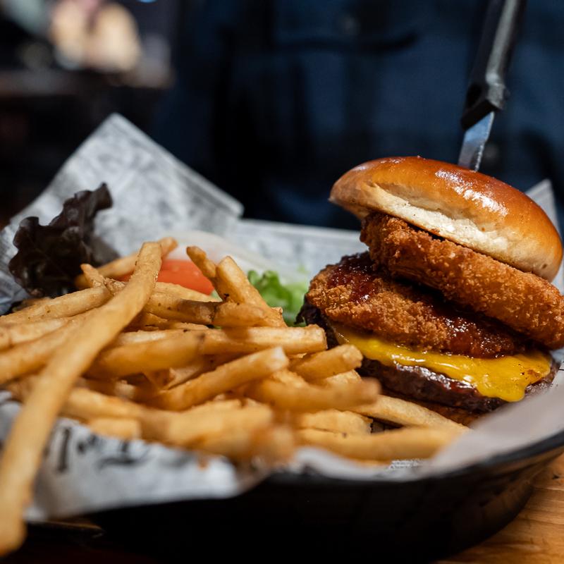 Half-pound Angus burger piled high with Smoked Bacon, Cheddar Cheese, & our slow-smoked Pulled Pork. Served with lettuce tomato, pickles & onion.