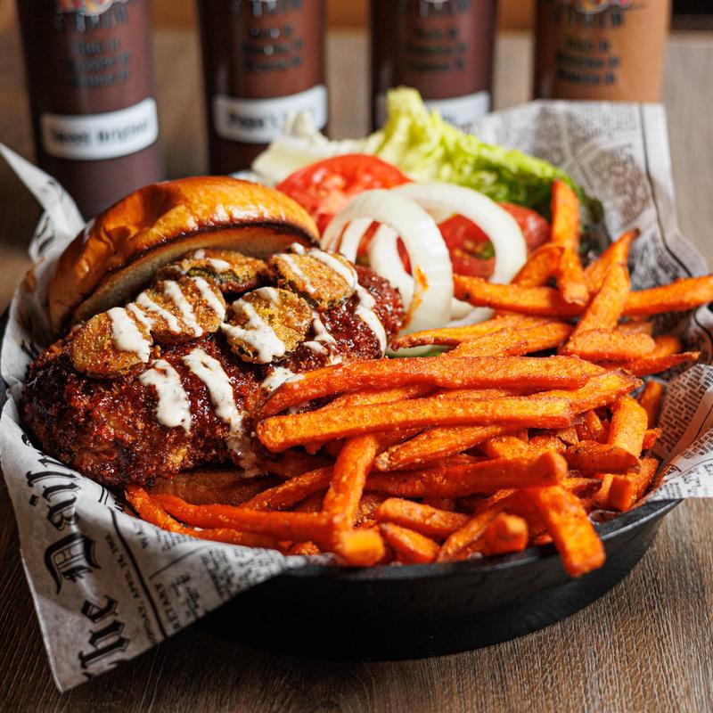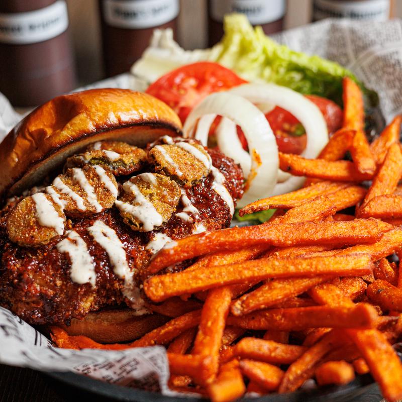 Marinated Red Bird Farms chicken breast is breaded & deep-fried, then tossed in our traditional Nashville hot sauce & topped with our deep-fried pickle chips. Served with our horseradish Ranch on our Brioche bun.
