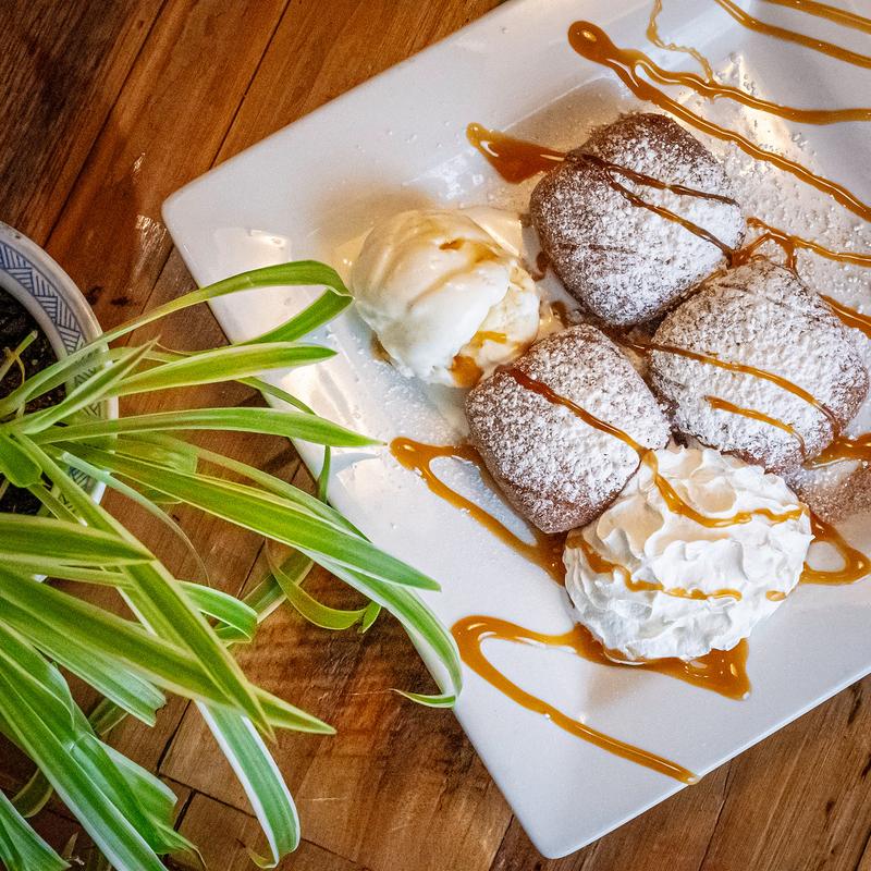 Western Twist on a French classic. Tossed in cinnamon sugar, drizzled with caramel & powdered sugar. Served with whipped cream & vanilla ice cream. Served three to an order.
