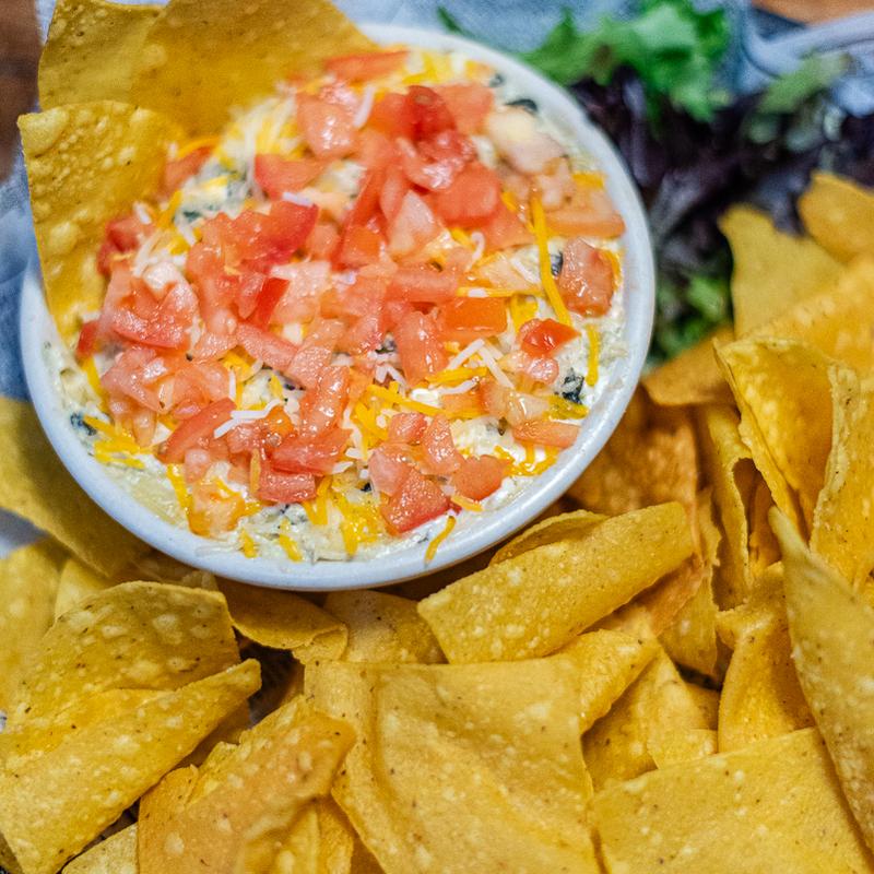 An elegant mixture of cheeses, garlic, cream, spinach, roasted green chiles, & artichoke hearts - now enhanced with bleu cheese crumbles & green olives. Served with tortilla chips for dipping. (GF)