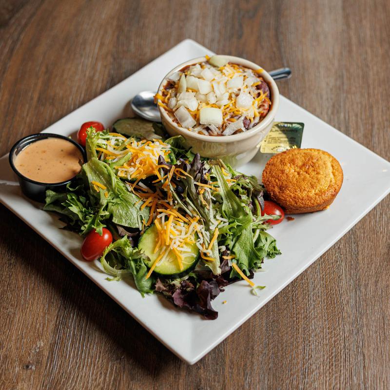 Seasoned ground beef, Stout beer, tomatoes, & onion alongside traditional black, pinto, & kidney beans. Topped with shredded cheese & diced onion. Served with cornbread.