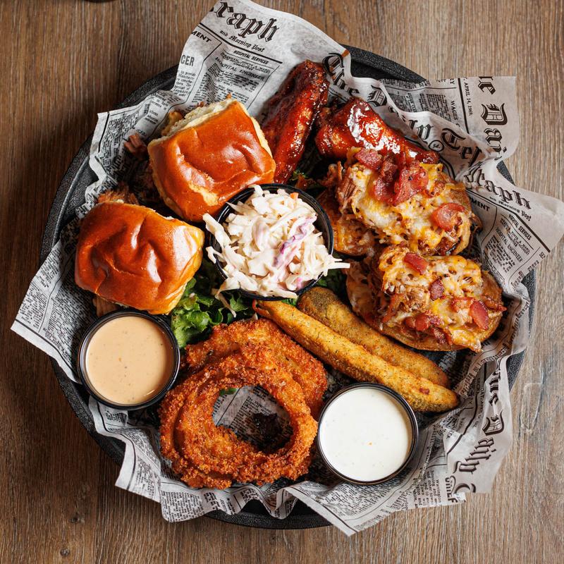 All of our favorites on one plate: Sliders, Skins, Wings, Rings, & Deep Fried Pickles. Great for 2-4 people to share! Sorry, no substitutions! Served with Slaw, Ranch, & BBQ Ranch,.